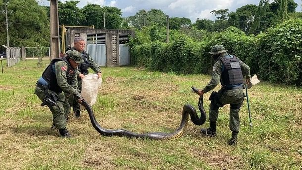 Ela foi encaminhada para a sede do BPA, onde foi avaliada por veterinários, segundo a Polícia, após passar por procedimentos e constatado a boa saúde da cobra, ela foi solta no Parque Estadual do Utinga. Foto reprodução PM